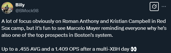 Regardless, the trio of prospects the Red Sox have is putting them in a great position for both the present and the future. Anthony and Campbell have made the most recent noise through the media, but Mayer is taking this opportunity to relax his hands and let his swing do the talking.